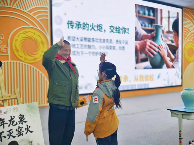 紧接着,青图“馆校合作”项目再添新篇,将这场文化盛宴精准送入校园。1月4日上午与1月5日下午,讲座分别走进金沙小学B区(三年级公开课)和同辉国际小学(五年级科普讲座)。活动针对青少年特点进行了专属的互动与教学设计,采用双视角讲述,将严谨的知识脉络与生动的工匠故事相结合。邱育展先生不仅通过PPT、视频展示青瓷的诞生过程,更设计了极具震撼力的现场互动环节——邀请学生上台参与瓷器鉴赏,并通过独特的“砸瓷”演示,直观阐释青瓷的物理特性与匠人精神,极大地激发了学生们对传统工艺的好奇心与探究欲。活动现场气氛热烈,问答环节互动踊跃,在孩子们心中播下了热爱传统文化、感知东方美学的种子。